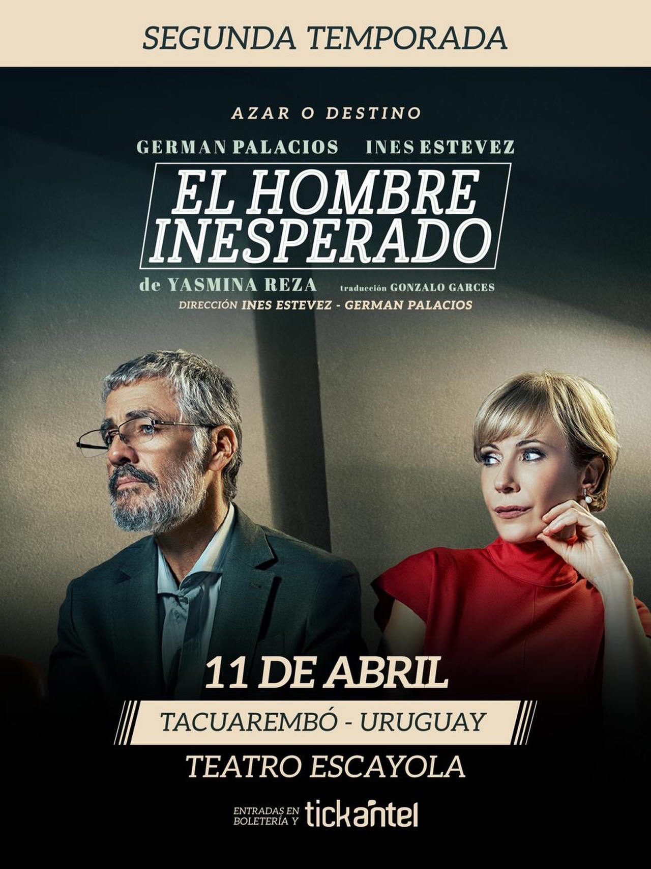 ¡Llega una obra imperdible a nuestra ciudad! Germán Palacios e Inés Estévez protagonizan “El Hombre Inesperado” de Yasmina Reza. Una historia fascinante sobre el azar, el destino y los encuentros que pueden cambiarlo todo.